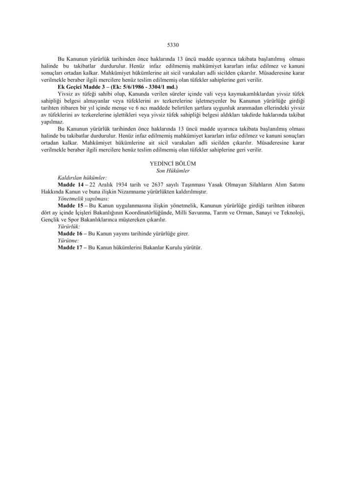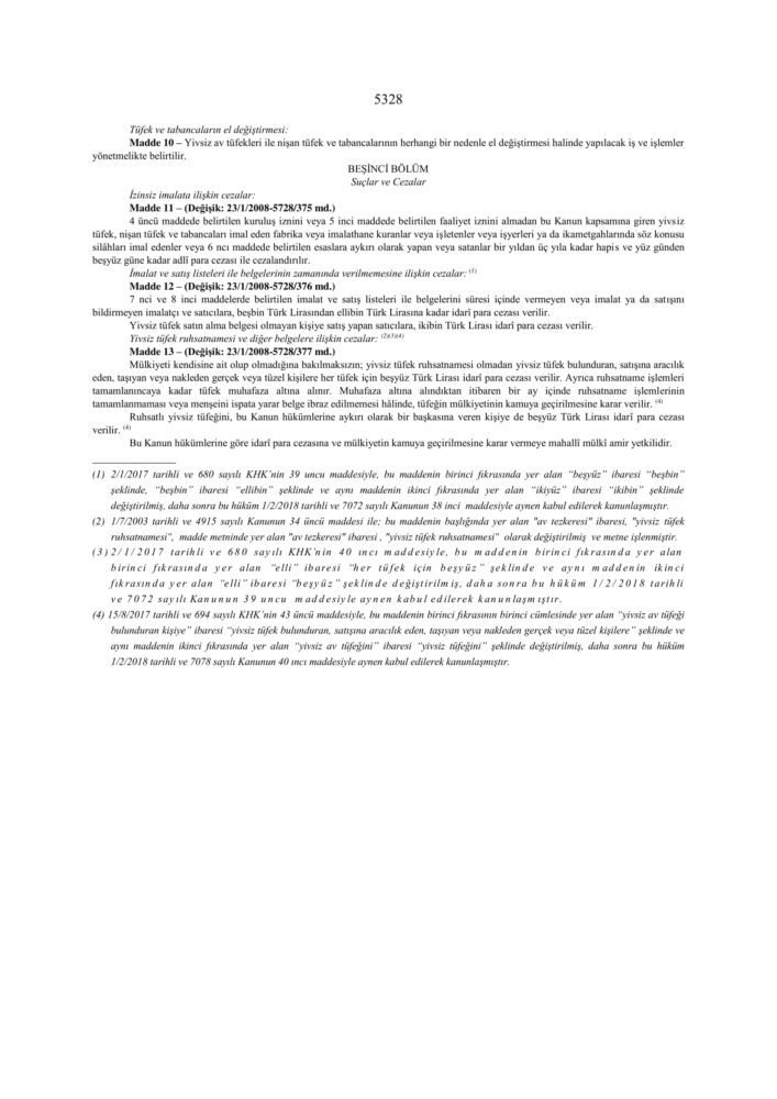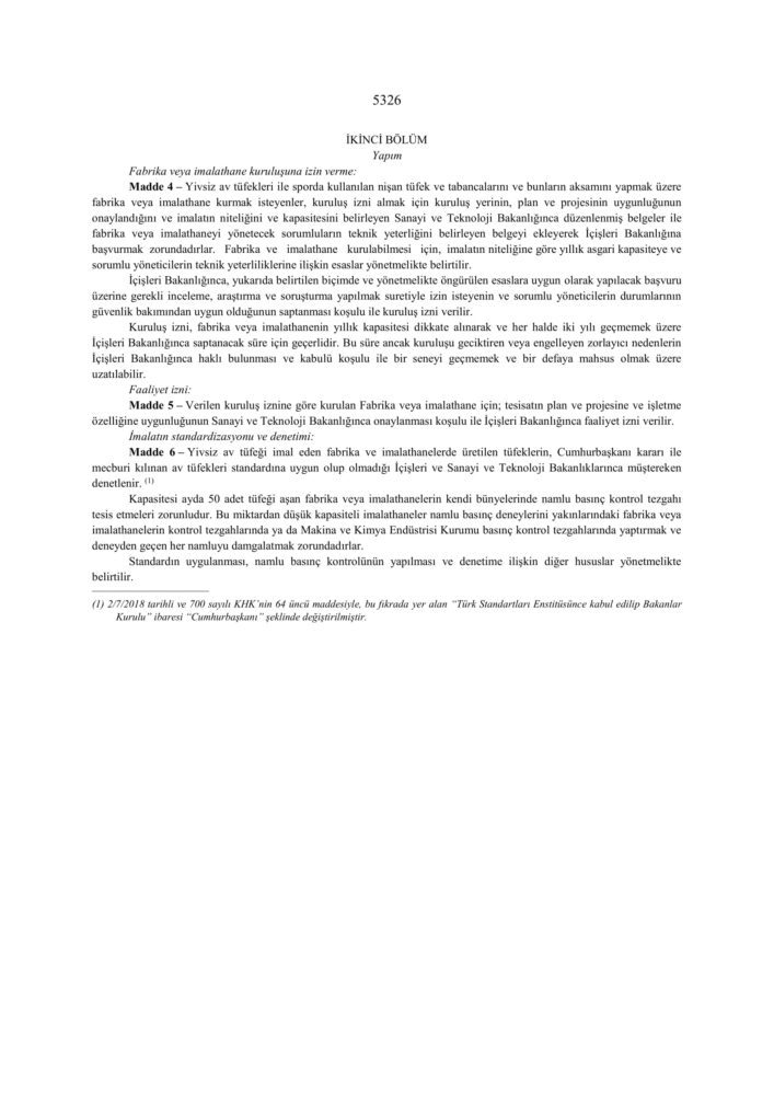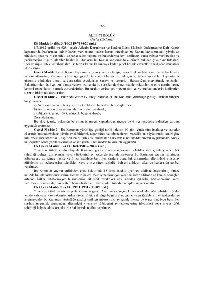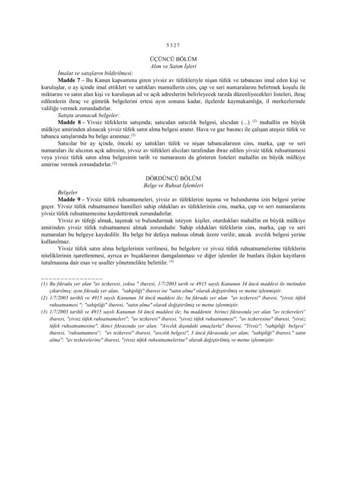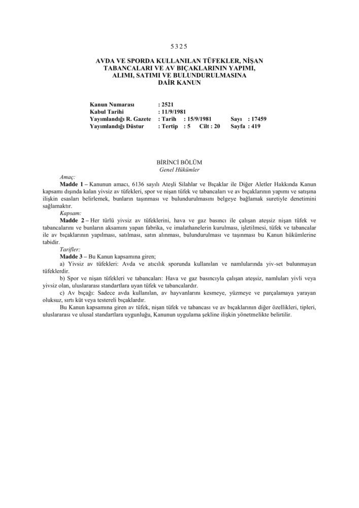 5325 Sayılı Avda ve Sporda Kullanılan Tüfekler, Nişan Tabancaları ve Av Bıçaklarının yapımı, Alımı, Satımı ve Bulundurulmasına Dair Kanun