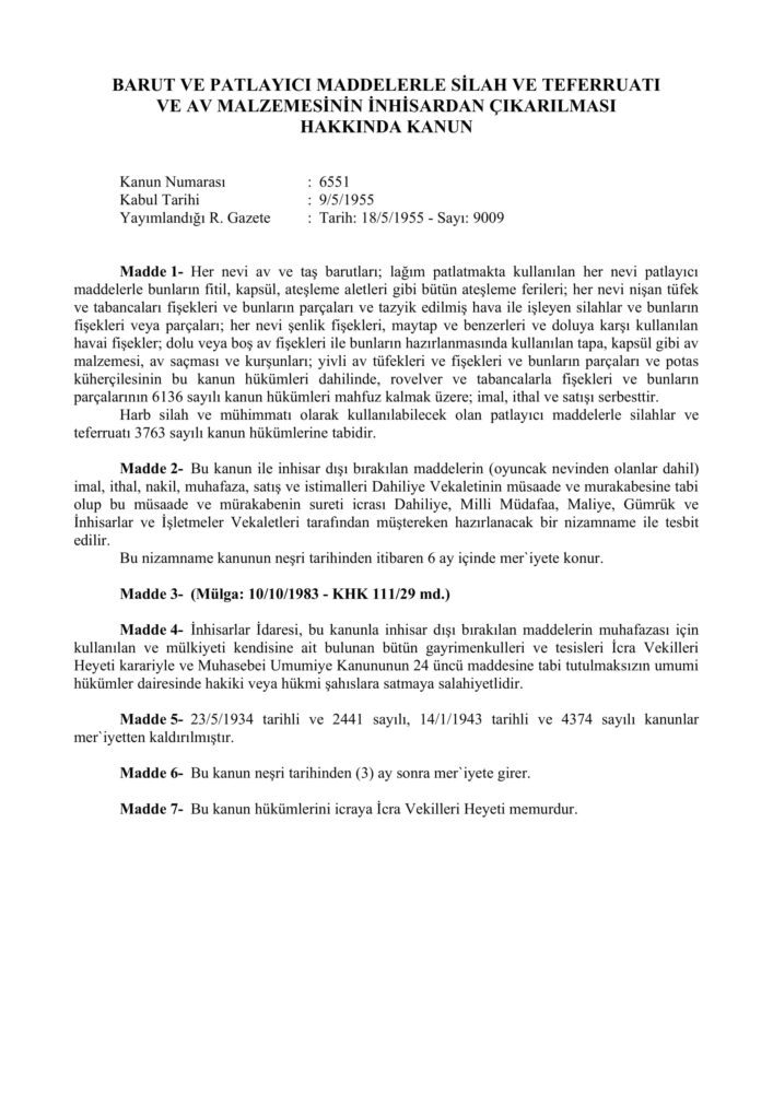 6551 Sayılı Barut ve Patlayıcı Maddelerle Silah ve Teferruatı ve Av Malzemesinin İnhasardan Çıkarılması Hakkında Kanun